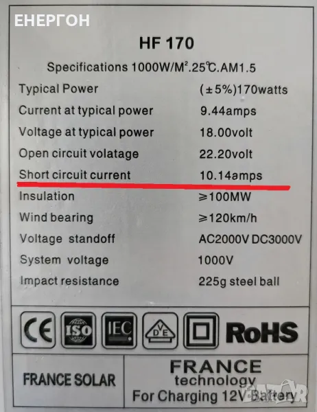 Здравейте, нашата фирма разработи съвместно със завод производител - соларен панел специално създаден за 12v системи! Реални 170 вата при 10.14А ток !! Най високия клас поликристални клетки ! Обърнете внимание на това какъв панел ви трябва, защото масово се продават панели по 150, 200, 250, 270 вата на които ампеража е най много 6-7А . Тяхното напрежение е много над нуждите на 12волтовата система обикновено са около 38 - 45 волта. Затова имате нисък ампераж и ненужно високо напрежение. а точно амперите са силата която зарежда акумулатора. Затова дадохме поръчка на завод - производител. И създадохме по наш модел- панел с високо КПД подходящ САМО за 12волтови системи. С максималния