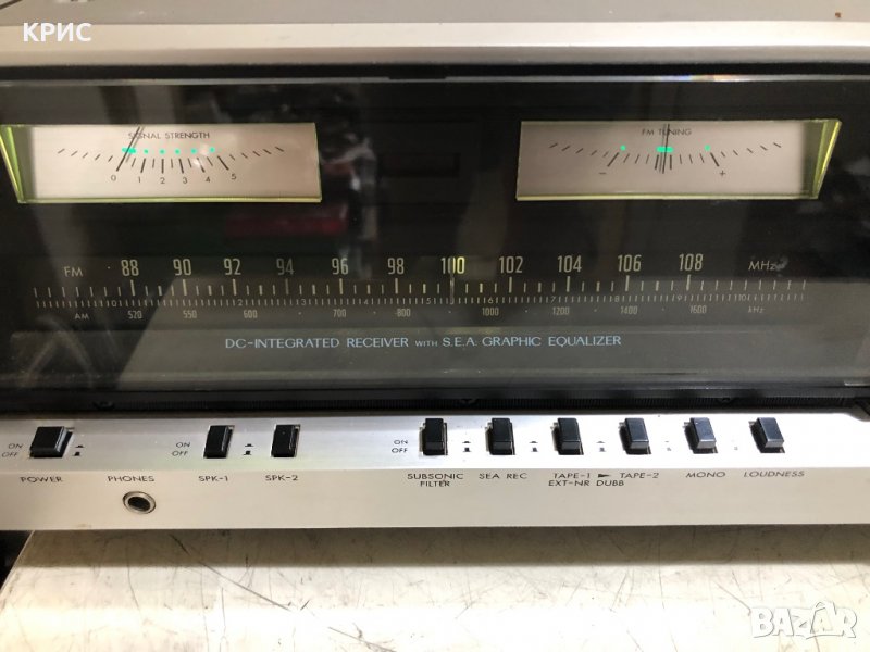Произведен в Япония, широкоформатен приемник с алуминиево лице от края на 70-те с DC усилвателна технология. 35 вата на канал при 8 ома (общо 70 вата), поддържа натоварвания до 4 ома (до 56 вата на канал при 1Khz). A и B високоговорители. 5 аналогови аудио входа (включително фоно) с 2 изхода (включително Din щепсел и лента монитор). Подзвуков филтър и контрол на силата на звука. Вграден 5-лентов SEA графичен еквалайзер, идеален за настройка на вашата музика към вашия високоговорител и стая. Страхотни технически характеристики (0,01% THD, 70 за фантастично затихване на басите и невероятен честотен диапазон 5kHz-40kHz). Големи измервателни уреди за сигнала и настройка с хладно зелено осветление и на стрелката за намиране на станциите. Фантастично изглеждащ като цяло, ретро приемник с размер на чудовище, който звучи страхотно!