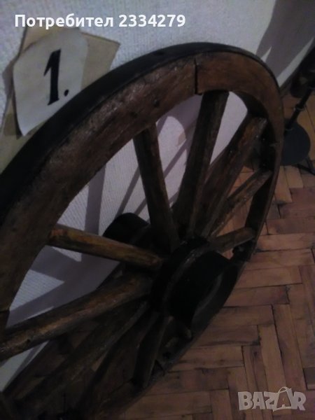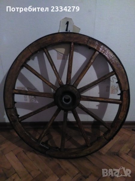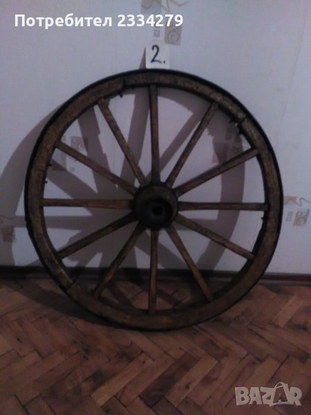 Две стари ръчно изработени колела от файтон, голяма каруца работа на майстор колар,преди 100 години. Задно голямо с размери: високо 85см.,широко 5см., цена 60лв. ; предно малко: високо 70см.,широко 4см.,цена 55лв. Запазена добра декорация за битова къща,двор,градина,заведение.