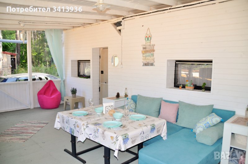 Караваната има голяма веранда(30м2), на която са разположени кухня, голям барплот с три стола, маса за 6 човека, барбарон и разтегателен диван на който може да се спи(145/220).