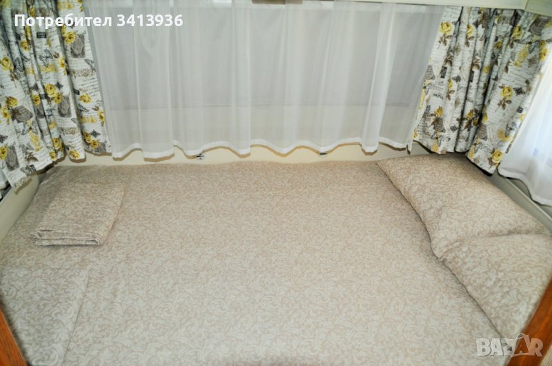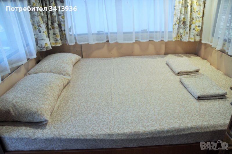 Разполага с две легла в караваната и разтегателен диван на верандата. Едното легло в каравана е с размер 140/200, а другото с размер 150/200, гардероб, шкафчета и климатик.