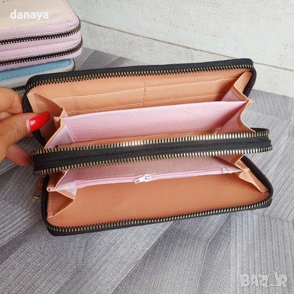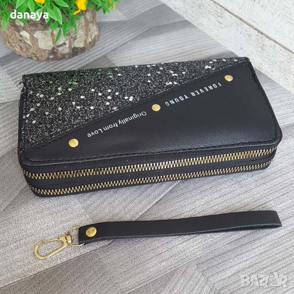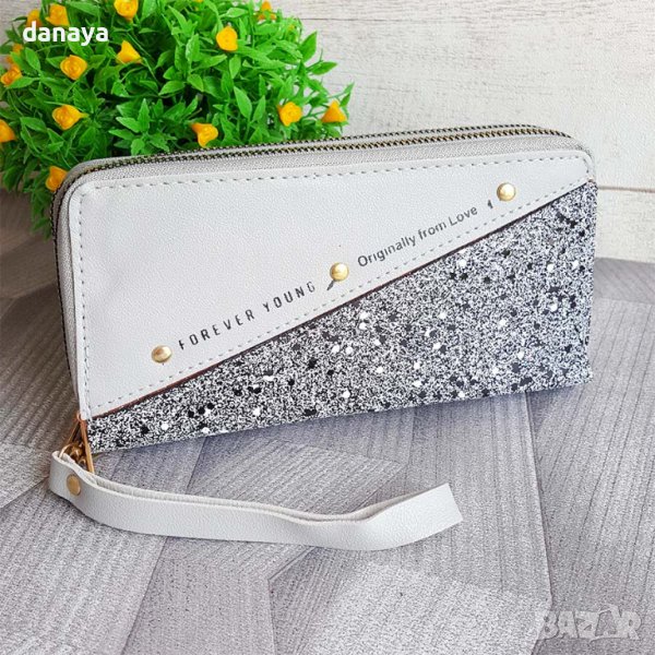 Красиво и изящно кожено портмоне с декорация брокатени частици и надпис Forever Young Originally from Love. Пормонето е разделено на две големи отделения, като всяко от тях се отваря и затваря с цип. Портмонето има допълнителни прегради – за документи, визитки, също така има и малко отделение, затварящо се с цип за стотинки. Всяко портмоне си има кожена каишка, с която ще го превърнете в мини чантичка.