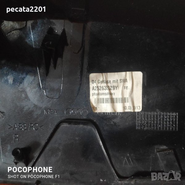 Продавам - оригинална капачка дясно огледало за Ауди А8 Д4 (Audi A8 D4). Капачката е черна на цвят, има забележки по боята, и едно счупено ушенце отвътре. Капачето е с оригинален номер A2526338 Z9Y. Цена - 45 лв