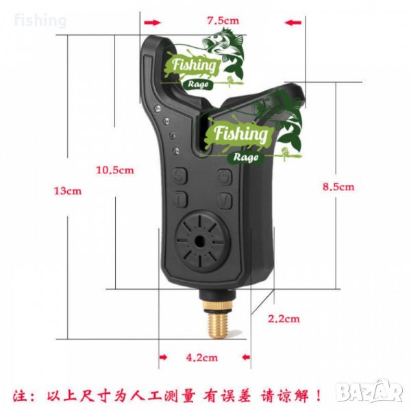 - Единият Сигнализатор в комплекта има червен светодиод, а другият има синя LED светлина. Сигнализаторите могат да показват ухапването в четири различни тона (бутон „T“) и четири различни обема (бутон „V“), както и нивото на чувствителност (бутон „S“). - Електрическият Сигнализатор Може да се използва универсално за всяка напречна греда, обикновена резбова дръжка или дори пръчка. Захранването както на сигнализатора, така и на приемника се осигурява от 3 AAA, т.е. мини батерии за молив (не са включени). Плъзнете задния капак, за да смените лесно батериите. - На гърба има и ярък светодиод, който осветява върха на подаващото устройство (Това може да се активира чрез натискане и задържане на бутона „T“.) - Приемникът е в състояние да индикира захапката в четири различни тона (бутон „T“) и четири различни обема (бутон „v“).