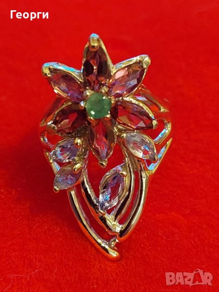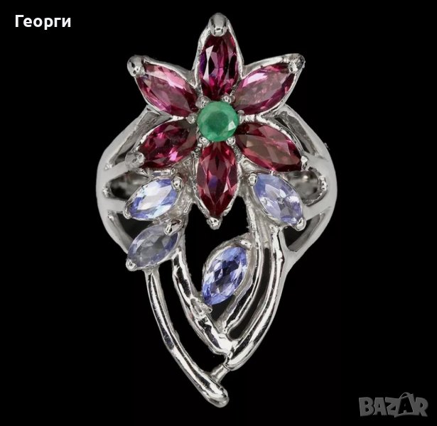 Зашеметяващ сребърен пръстен с Изумруд,Червени Гранати и Танзанити → Обява 37076729