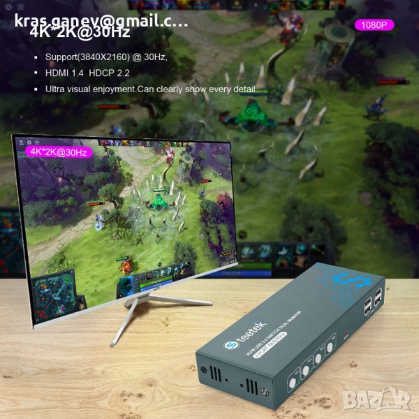 KVM превключвателят 2 следи ultra HD 4K @ 30Hz: KVM превключвателят HDMI поддържа резолюция от 4K x 2K (3840 x 2160) @ 30Hz /3D/1080P, прави изображението по-изящно и реалистично. С този KVM Switch 2 монитори можете да се насладите на най-луксозното видео. HDCP1.2 стандарти.