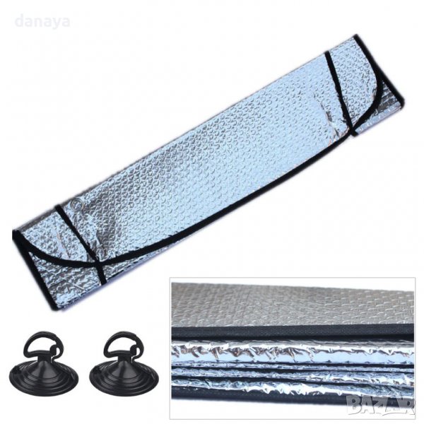 сенник за кола. Двустранен сенник за предно стъкло на автомобил. Преден сенник за кола. Универсален сенник подходящ за всички видове автомобили. Идеална защита през летния сезон. През лятото намалява загряването в купето на автомобила, волана и таблото. UV защита. Закрепването е с вакуум държачи на стъклото, включени в комплека (2бр.).
