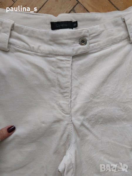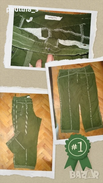 1️⃣. Колаж / L / 2XL - "Estelle". Цената е крайна 19,99лв. Карго еластични джинси с коси джобове, прави крачоли и страничен джоб с цип. Материята е памук и ликра с еластичност, хипоалергична и приятна за носене на голо през лятото. Много удобна и красива дреха, за спорт и туризъм или за разходка в парка. Шнуровете може да се нанижат на крачолите, извадила съм ги за снимките. Цветът е Слонова кост, без дефекти.