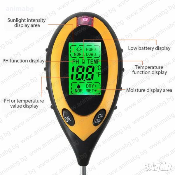 Този уред измерва влага, температура, PH и осветеност на мястото около уреда.