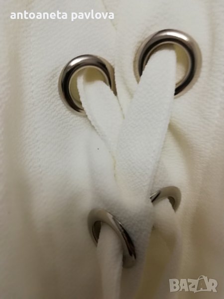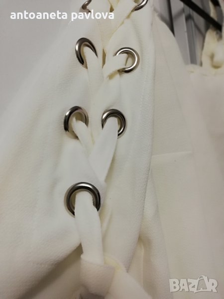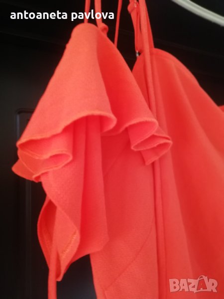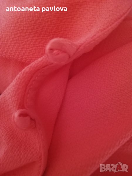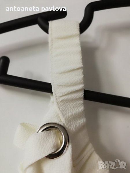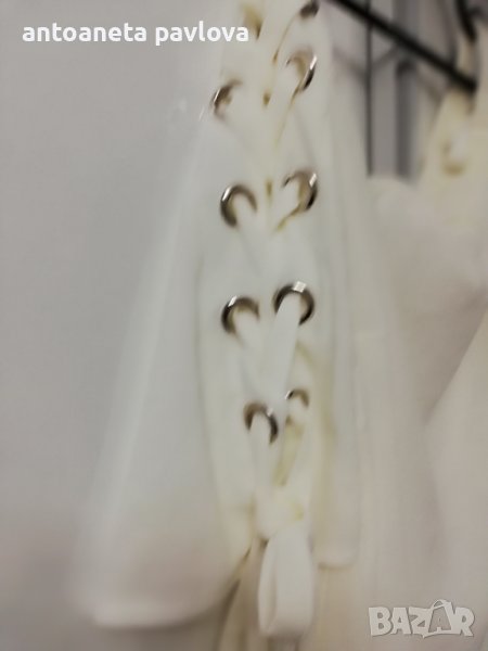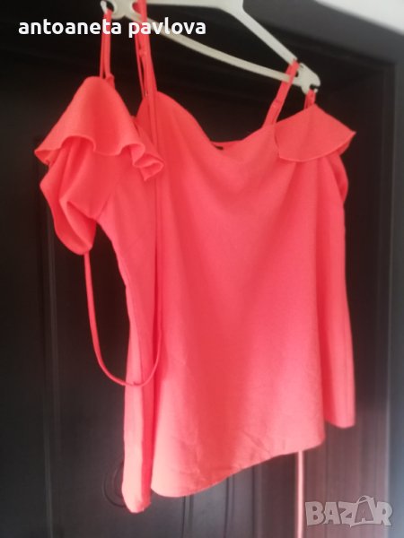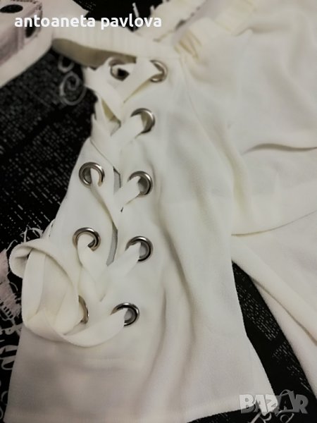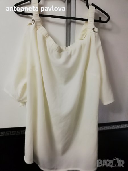 Туника от полиестер с ефектен ръкав от кабзи нанизани с връзки от същата материя Обособява се голо рамо като се облече Набраната част се явява като презрамка Малко по -къса е като дължина 57-58см. Гр Об 118-125см Нова без етикет дрехи внос Налична и в бомбонено розово _оранжево.