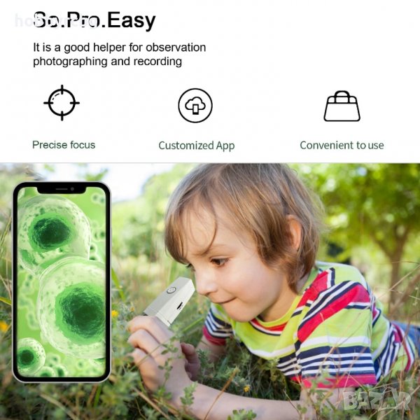 Микроскопът се свързва към компютър, лаптоп или телефон чрез WiFi връзка или стандартен USB кабел. Микроскопът е много удобен и лесен за употреба и не изисква никакви специални знания или умения и е подходящ за деца.