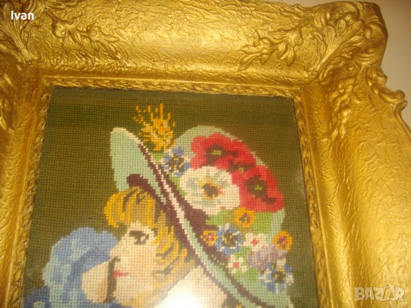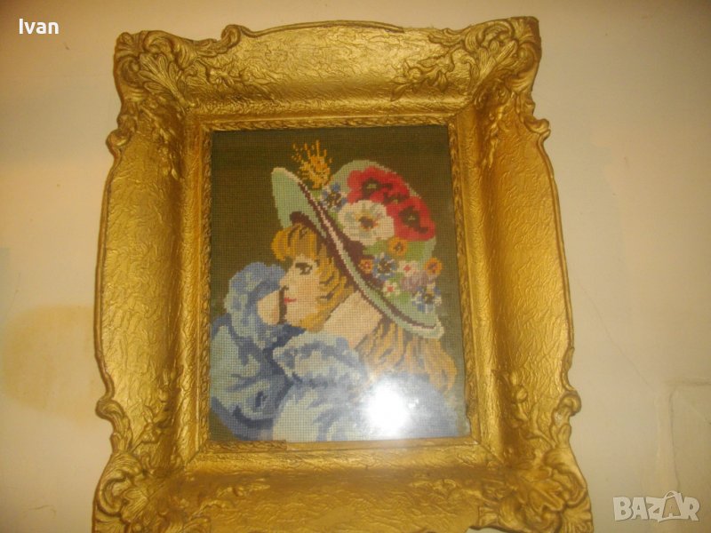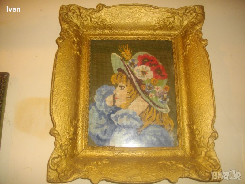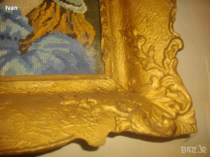 гоблена е в масивна рамка, изцяло от гипс, без дървесина под гипса.Дълбоки релефни орнаменти. Дълбочина на рамката - 130 мм. Ширина рамка - 390 мм, дължина - 460 мм.