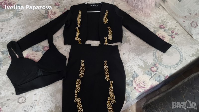 Комплектът е чисто нов,страхотен и секси на луксозната българска марка AMIA FASHION ,ило по-известна с предишното си име "Dress passion" Състои се от три части пола и късо сако с позлатени синджири и красиво бюстие с push-up ефект.Оригинала е 100 % идентичен със снимката.