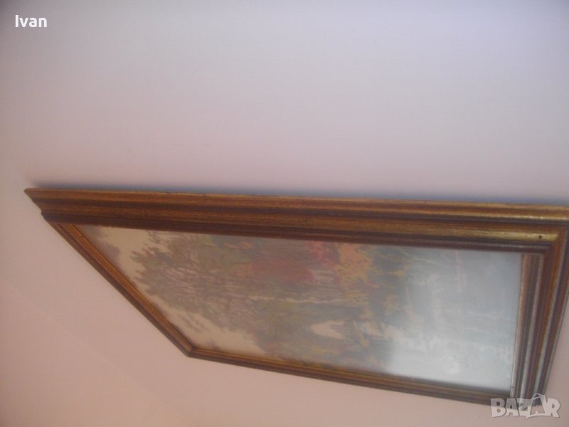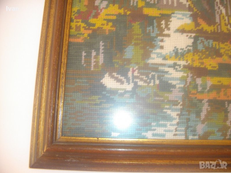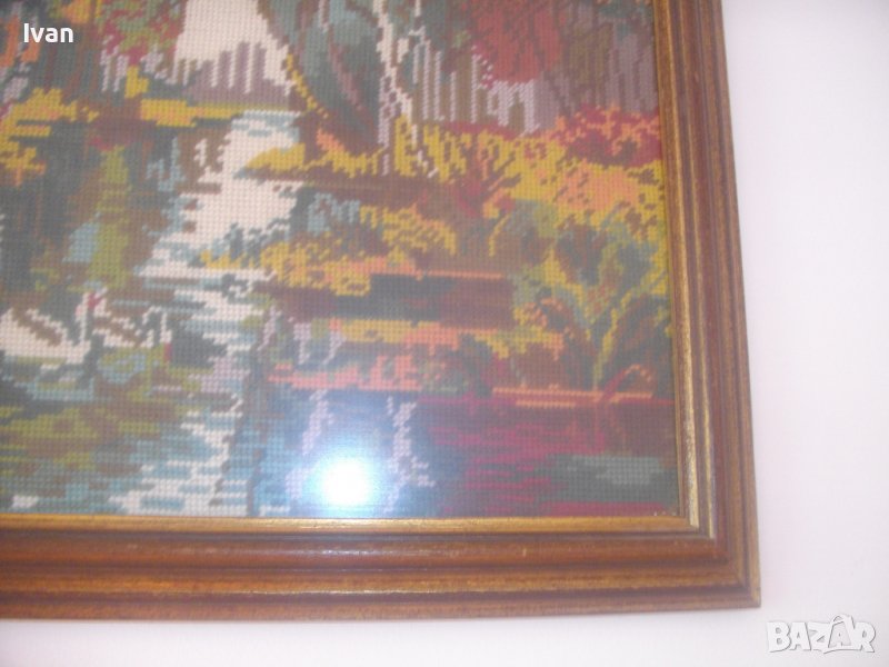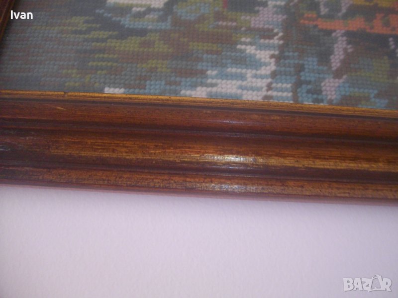 Гоблена е рамкиран-размери на рамката 410х550мм.Рамката е широка,класическа,на 3 зъба,буков пресован шперплат.