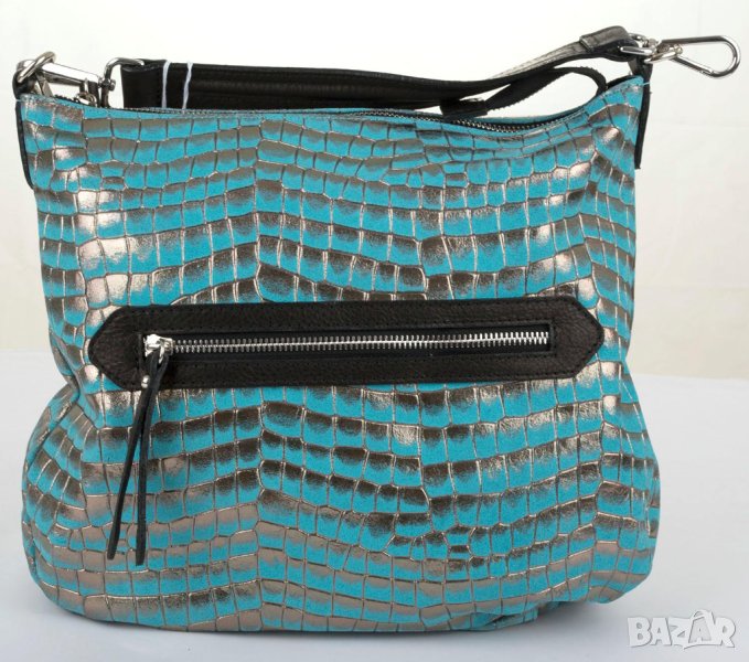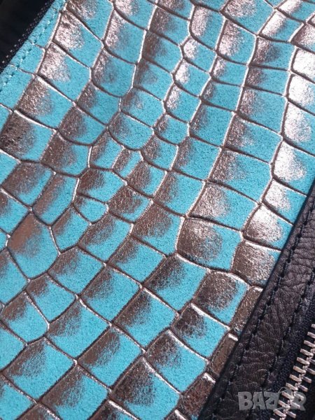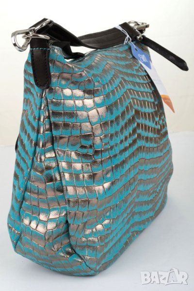Дамска кожена чанта в цвят тюркоаз с лъскав принт марка Emilio Masi → Обява 37115024