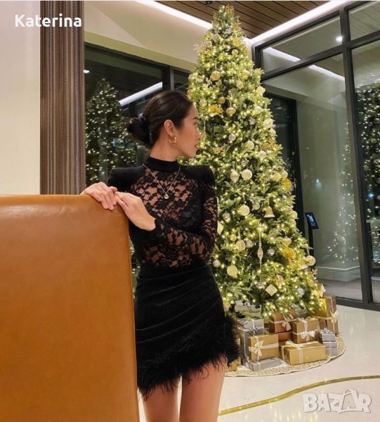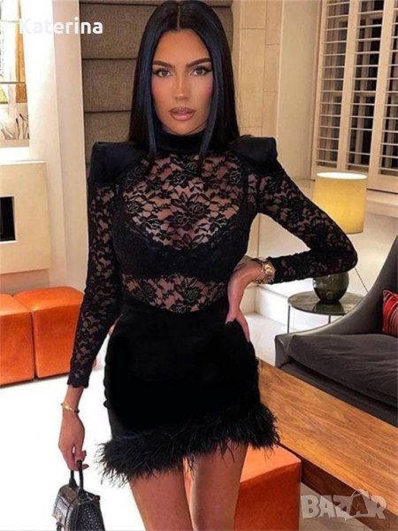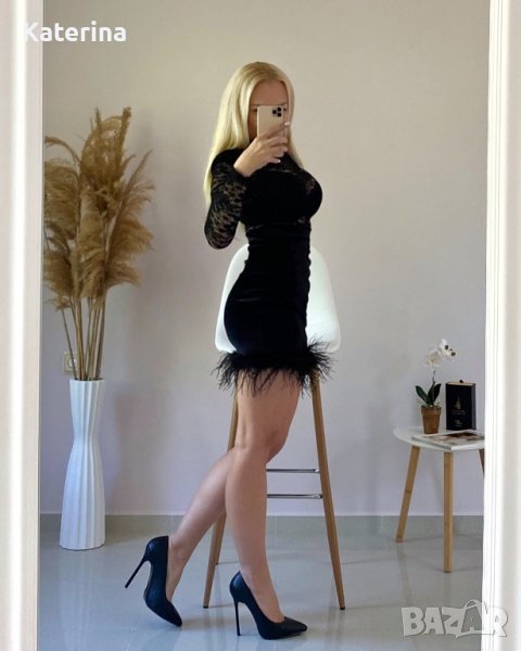 Луксозна, къса, черна рокля с пера и дантела → Обява 37117566