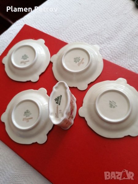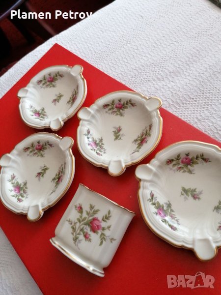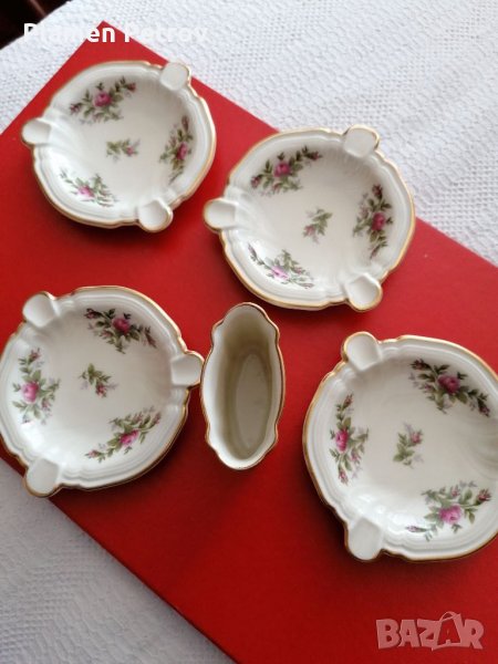 Четири броя порцеланови пепелници на фирма Розентал Германия и порцеланова ваза за цигари Всички са с флорални мотиви с размери от диаметър 10 см и височина 1,5 см, а вазата с размери от височина 6 см и дължина 6 см без забележки са и петте продукта, използват се при игра на карти, чист бридж по края има контур златна лентичка