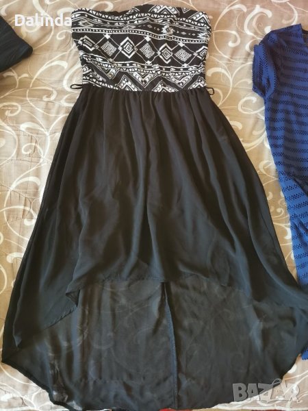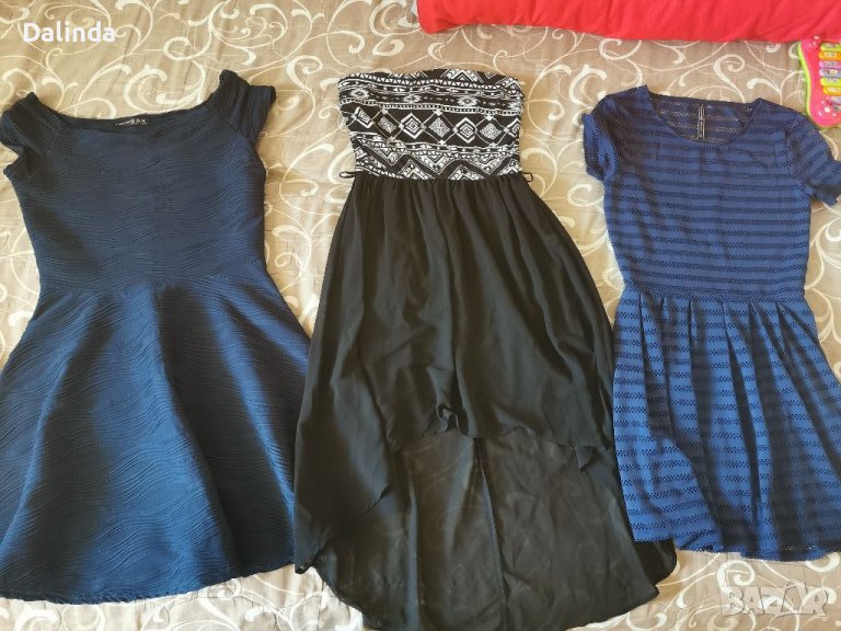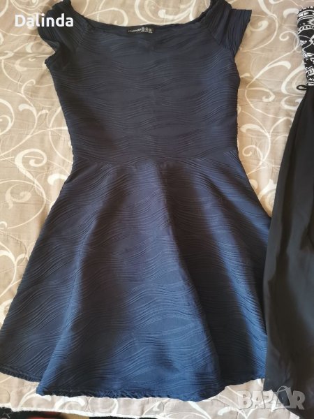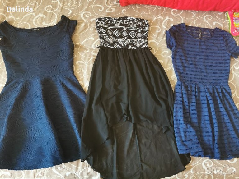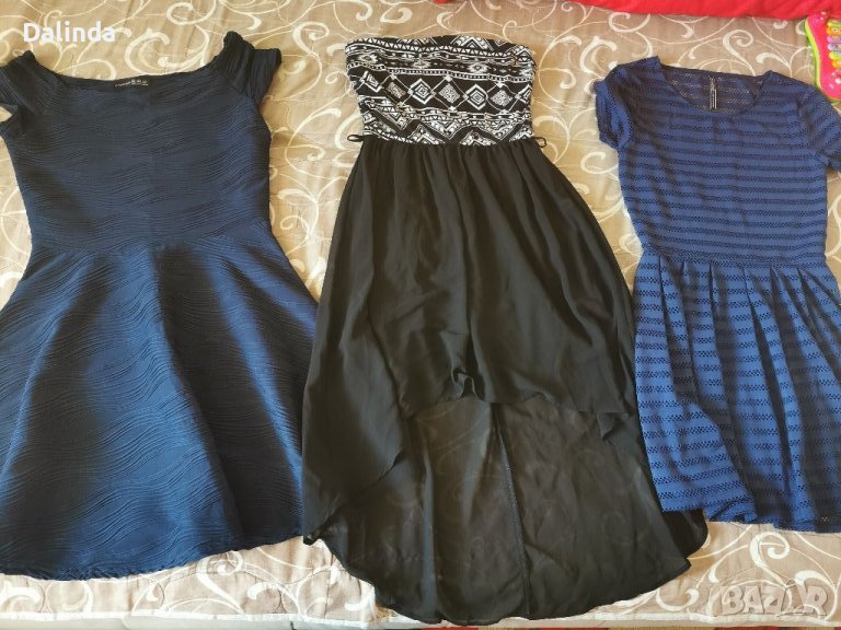 Три модела елегантни рокли, Първата е тъмно синя, разкроена, подчертава талията, обличана само веднъж за една фотосесия, без забележка-15лв.
