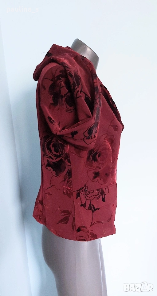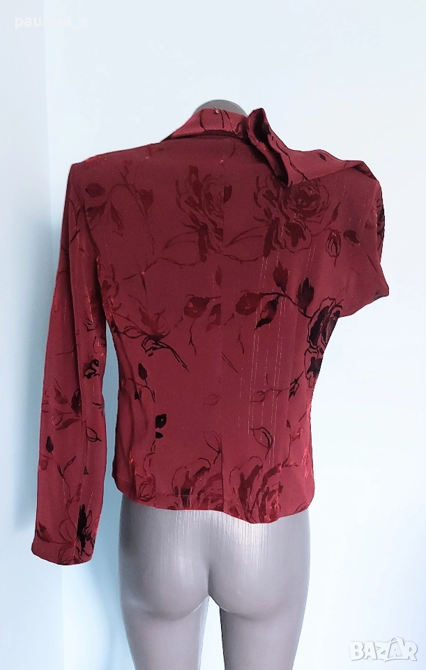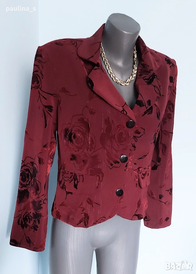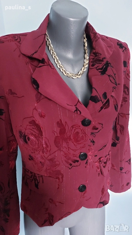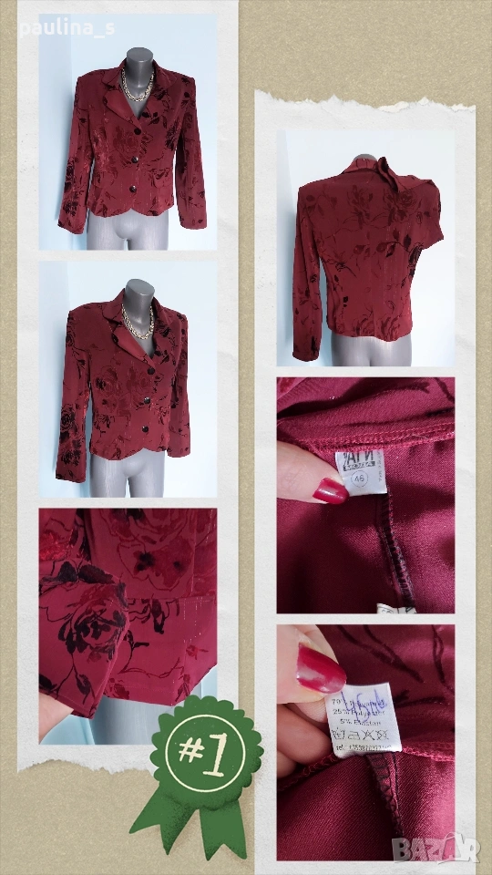 3️⃣. Колаж / L / 2XL - Луксозно сако за офис или повод "Аги"мода. Цената е крайна, без пазарлъци 15 евро. Изключително стилно дамско сако в Бордо, винено червено. Платът има еластичност и покрива няколко размера. Той е ефектен с плюшен флорален принт и блестящи нишки. Няма джобове, само на капаци е. Обличано е веднъж за повод, без следи от употреба, като ново.