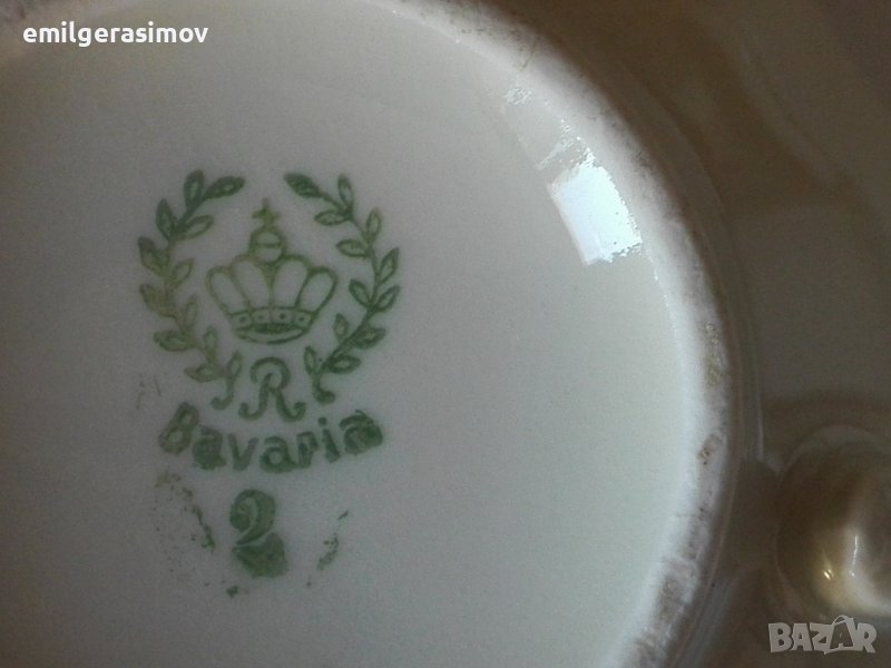 1. Разкошен сервиз за чай от баварски порцелан с позлата- 14 части. Отлично състояние. Маркиран .Голяма кана с височина 29 см. , по- малка кана - 20 см , захарница - 15 см. , кана за мляко 16 см. , малка каничка - 9 см. и шест чашки с височина 5 см. и диаметър 10 см.
