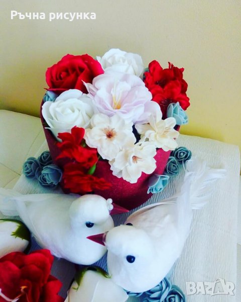 Сватбена декорация с гълъби ,кутия със сапунени рози на поставка и две сватбени картички , снимка 1 - Декорация за дома - 37137741 Сватбена декорация с гълъби ,кутия със сапунени рози на поставка и две сватбени картички , снимка 2 - Декорация за дома - 37137741 Сватбена декорация с гълъби ,кутия със сапунени рози на поставка и две сватбени картички , снимка 3 - Декорация за дома - 37137741 1/3