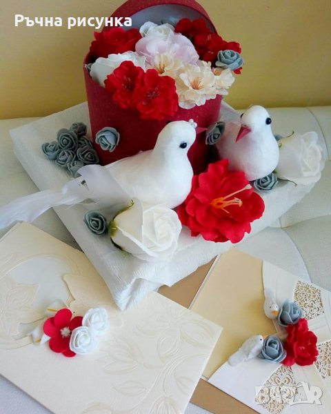 Сватбена декорация с гълъби ,кутия със сапунени рози на поставка и две сватбени картички → Обява 37137741