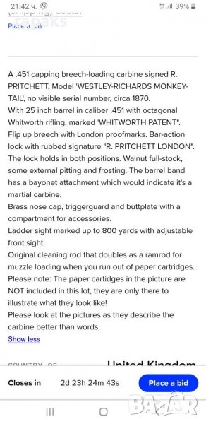 Продавам прекрасна колекционерска карабина Westley Richards Monkey с обща дължина 110 см. Висококачествена за онова време 8 канална капсолийка/фишеклийка. Смята се за предшественик на Шаспо, но
