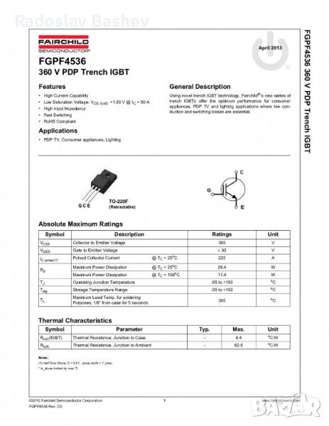 Транзистор IGBT FGPF4536 TO-220-3 360V 20A 28.4W → Обява 37147664