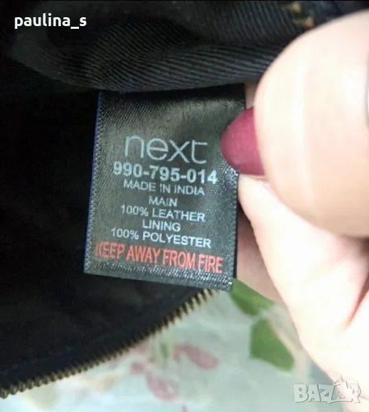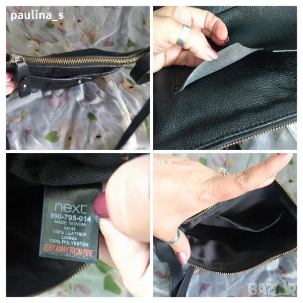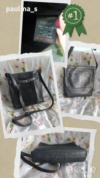 1️⃣. Колаж / "Next". Цената е крайна 99,99лв / 50 евро. Дамска маркова чанта от естествена кожа с дълга дръжка за през тялото. Има едно отделение, един вътрешен джоб, един външен джоб за документи и метален цип. Изработката е перфектна и на ниво, няма забележки. 26см / 24см / 5см дъно.