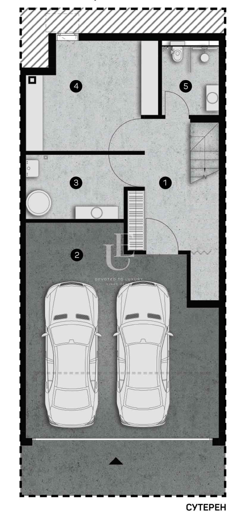 Сутерен с площ: двоен гараж; техническо помещение; баня с тоалетна; стая.