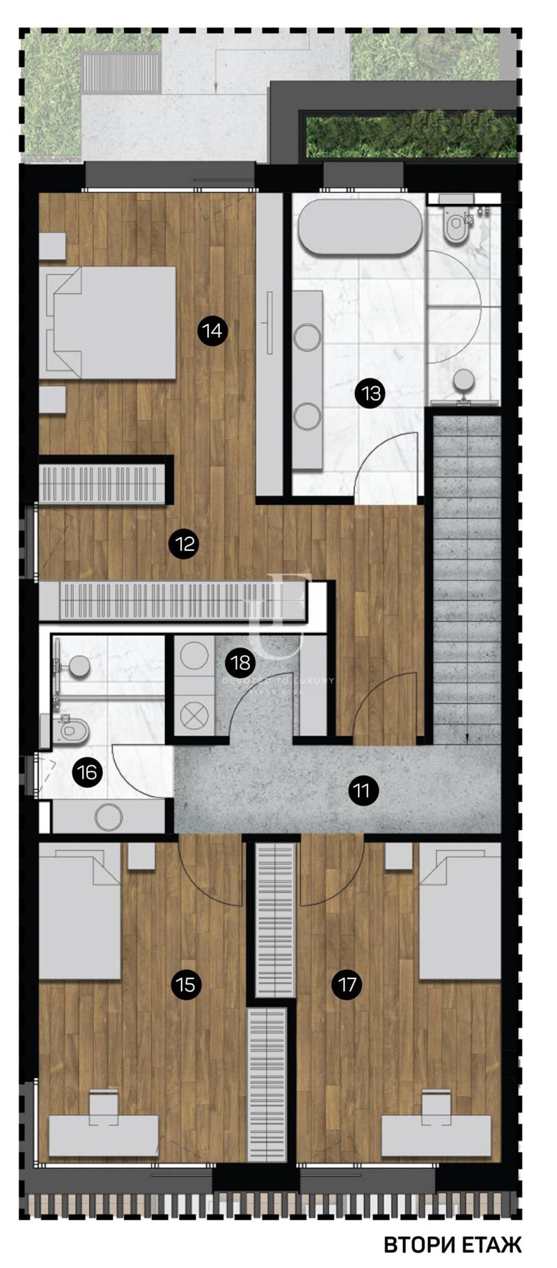 2-ро ниво: родителска спалня с дрешник и баня с тоалетна; две спални; баня с тоалетна; мокро помещение. Цената е без включен ДДС. Ref. ID:17763
