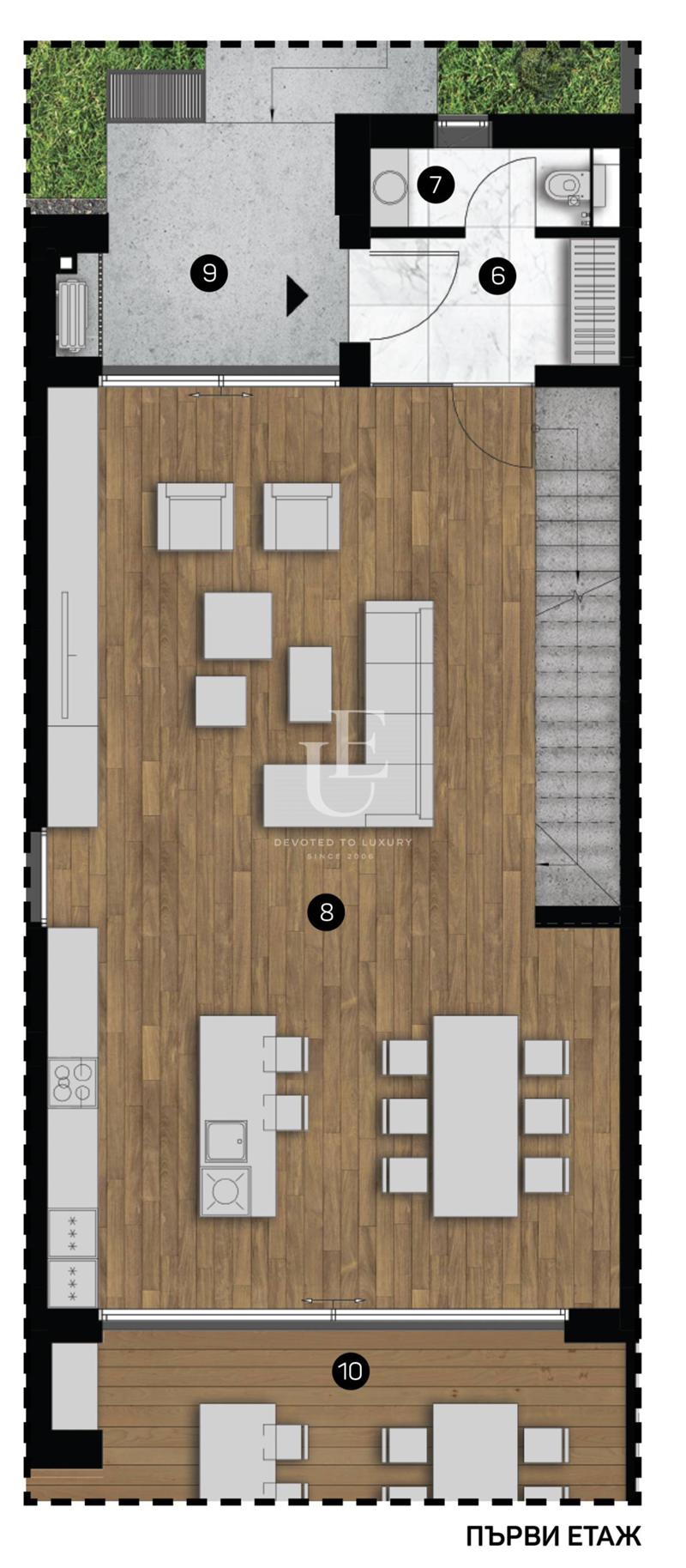 1-вo ниво: входно антре; тоалетна за гости; дневна с трапезария; кухня; две покрити тераси; излаз на двор-градина.