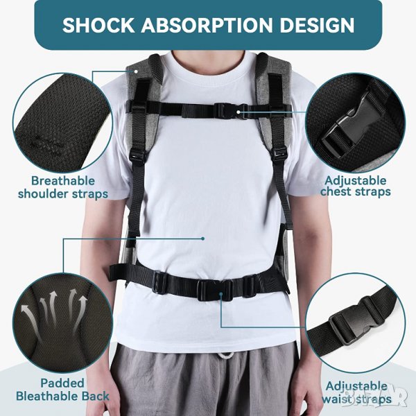 се предлага с ремък за рамо, кръст и закопчалка за гърдите, които помагат за