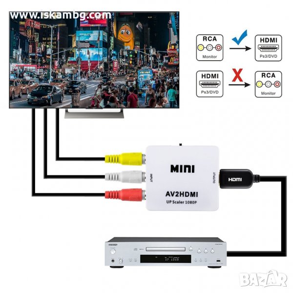 Конвертор RCA / AV към HDMI преобразува аналоговия AV сигнал от изхода на дадено устройство в цифров HDMI сигнал.
