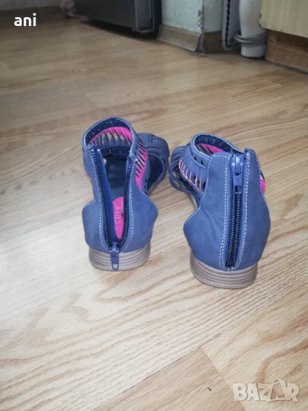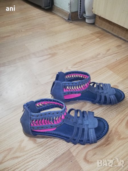Тъмно сини сандали с капси и ресни и розово, отзад със цип,много красиви, омаляха за няколко обувани. В много добро състояние са