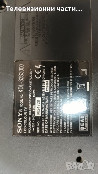 Sony KDL-32S3000 с дефектно захранване и Main Board-06А90-11 T315XW02/4H.V1448.691/D/T315XW02 V.E → Обява 37168108