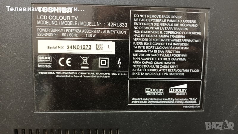 Toshiba 42RL833 с дефектен Main Board-здрав панел LC420EUN(SD)(V1)/PE0957 A V28A001258A1/6917L-0061A