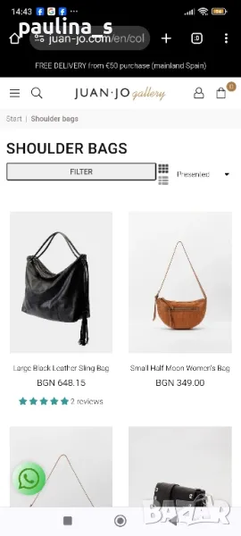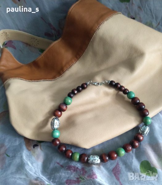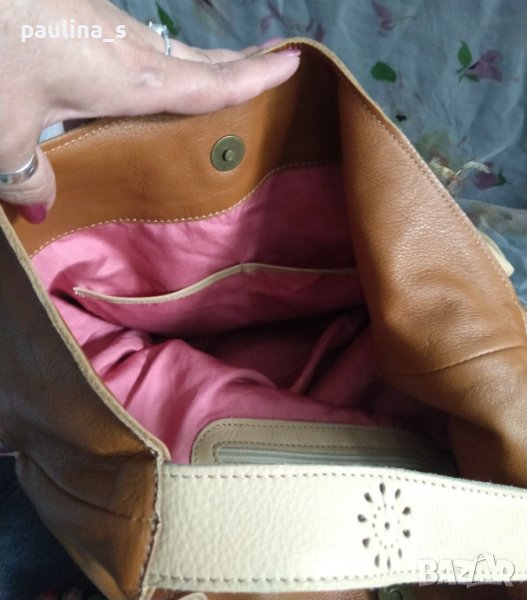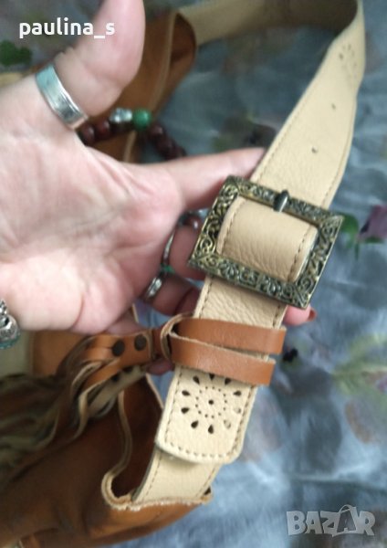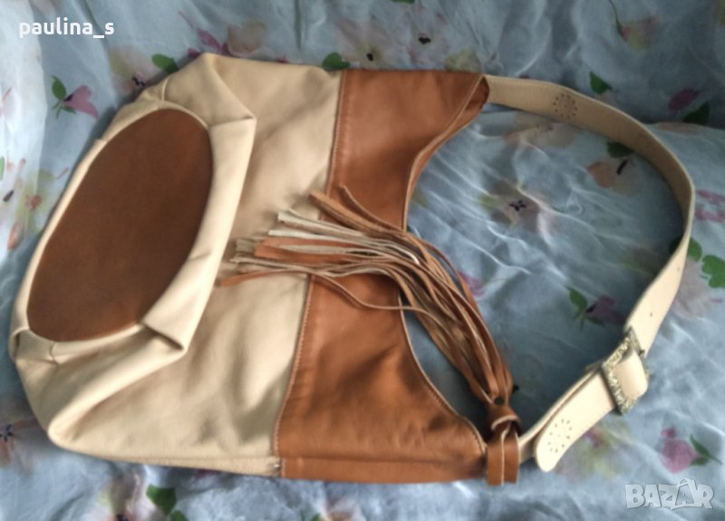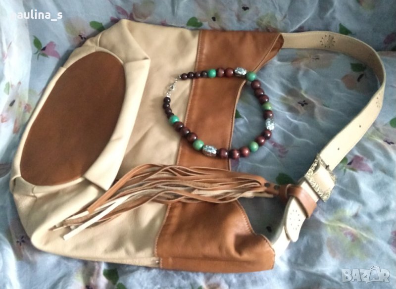 1️⃣ . Винтидж! - "Juan Jo". Рядка находка, Естествена кожа, ръчно изработена! Цената е крайна 264,99лв / 135 евро. Много удобна и красива дамска чанта тип торба за през рамо, с магнитно закопчаване. Дизайнерски артикул, ръчна изработка. Има една преграда, вътрешен джоб с цип, два големи джоба за смартфон. Декорациите са от ресни и пера, носена е два-три пъти, но се нуждая от парите и я продавам на 1/3 от цената. Колието е от сандалово дърво и се подарява, също е бутикова селекция. 41см / 32см / 16см дъно / 53см дръжка.