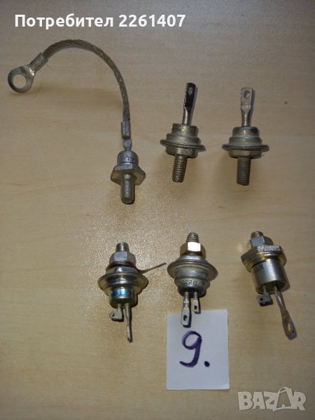 9. Диоди : KY718-5 бр.(20А, 360V) ; КД203Б- 4 бр.(10А, 560V); Д242А-1 бр.(10А, 100V); Д242Б- 5 бр.(5А, 100V); Д243А- 1 бр.(10А, 200V), Тиристори: Д235Г- 1 бр.(2А, 100V); Т7-4 -6 бр.(7А, 400V); КТ703 -6 бр.(15А, 400V ).