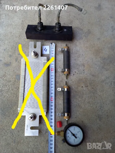 4. Товарно съпротивление- голямо 6.8 ома, 7 А/ Продадено!/ и малко 0.53 ома, 9 А (2 бр.); Диод изправителен 400V; 1,55V; 100A SKN 100/04 SEMIKRON (2 бр.) върху алуминиева плоча; манометър 2.5 MPa.