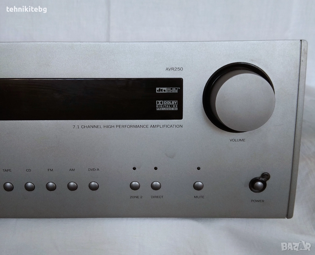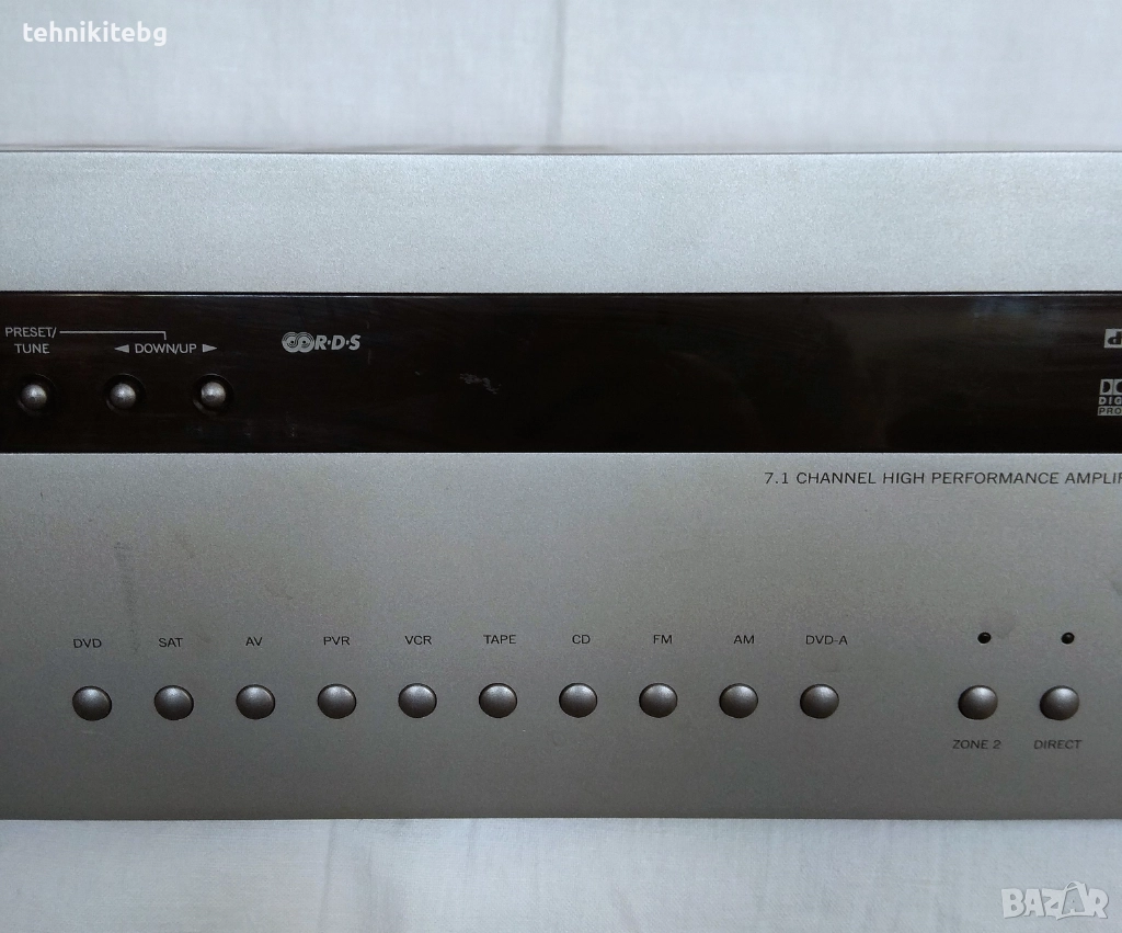Английски AV съраунд ресивър , 7 х 75 вата или 2 х 100 в стерео режим , Dolby Digital EX , DTS-ES , DTS24/96 , DTS Neo 6 , Dolby Pro Logic IIx , аудиофилски звук в съраунд и стерео благодарение на качествените 24-битови дакове Wolfson 192kHz , втора зона , RDS тунер с 46 станции памет , тороидален трансформатор , множество входове и изходи с позлатени букси , тегло 15.5 кг. Налично е и оригиналното дистанционно (+ 30 евро към цената), захранващ кабел с английски щепсел . Ресивърът е с добър външен вид , при включване дисплеят светва, но влиза в някакъв режим и се изключва сам след няколко секунди . Не е носен на сервиз и не знам какво му е . Лично внесен от Англия .