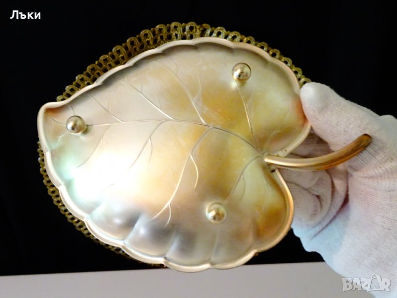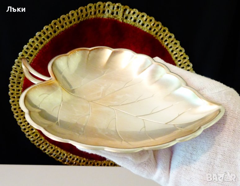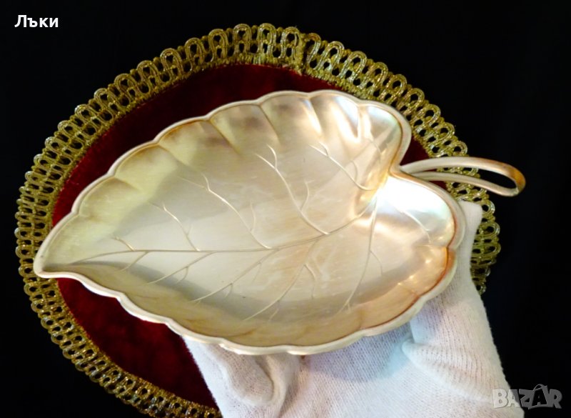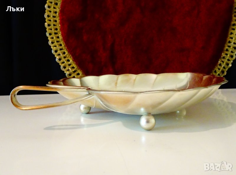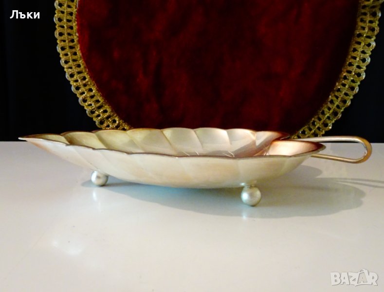 Западно Германска бонбониера,фруктиера,купичка за ядки на марката Quist,изработена от месинг,дебело посребрена с висока проба сребро.Има дизайн на листо.Стои стабилно на три крачета топчета.Височина 3 см.,дължина 19 см.,ширина 13.5 см.,тегло 120 гр.