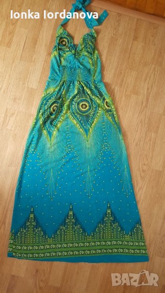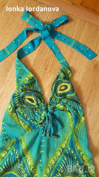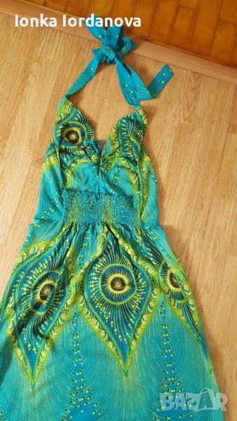 Лятна рокля от фин памучен плат.Цвят тюркоаз с щампа паунови пера.Гърба е на ластик и се завързва на врата.
