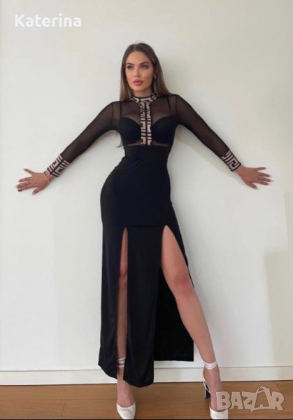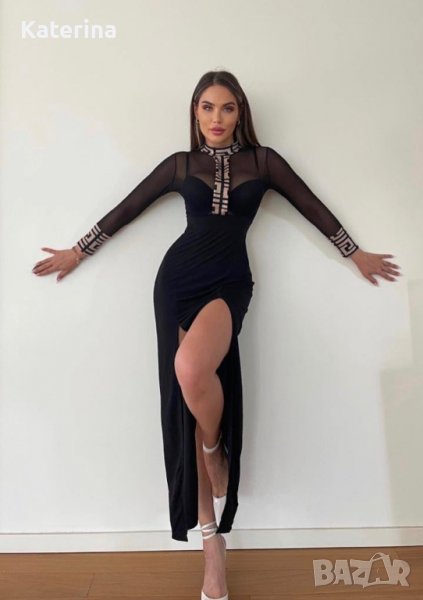 Много стилна и елегантна рокля. Подходяща за всеки официален повод. Горната част е с еластичен тюл. Има две цепки отстрани по дължината на бедрата.