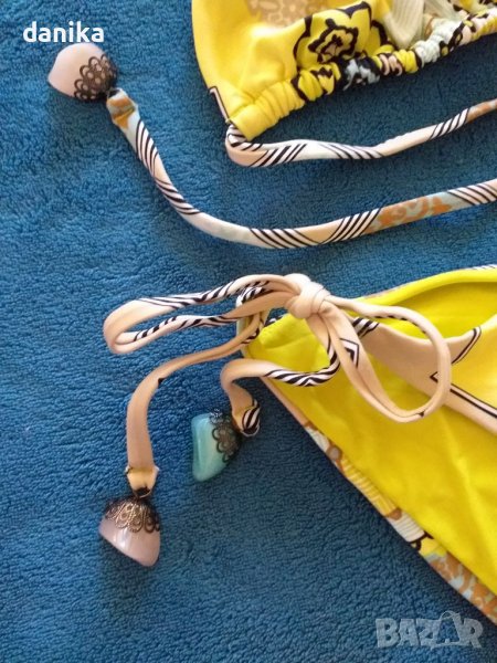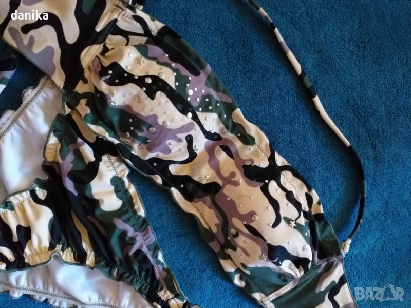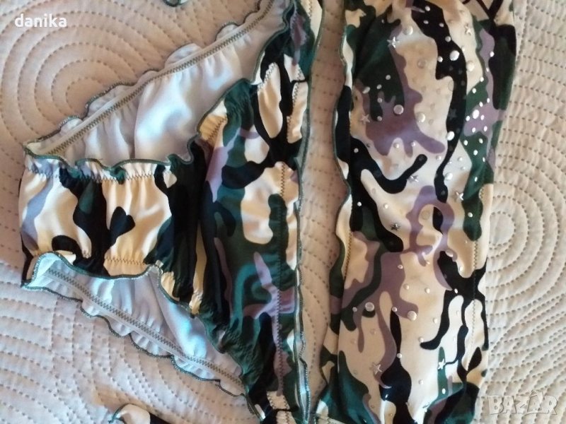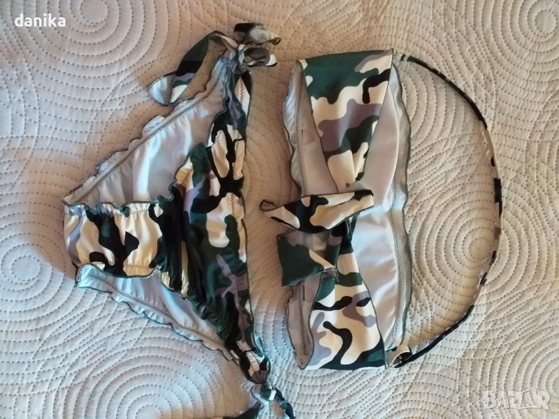 1.Дамска бански камуфлажни. По етикет размер М , но е с връзки и става и за S / M и за М / Л . Еластичен . Подплънки могат да се махат. Една презрамки през врата , която се регулира Актуален модел. Акцент капси на горнището.