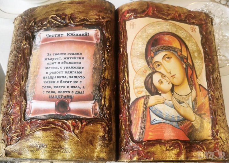 Авторска книга-икона с апликирана бутилка и оригинални пожелания за юбилей - подарък, който ще напомня, ще се ползва и радва всеки юбиляр.