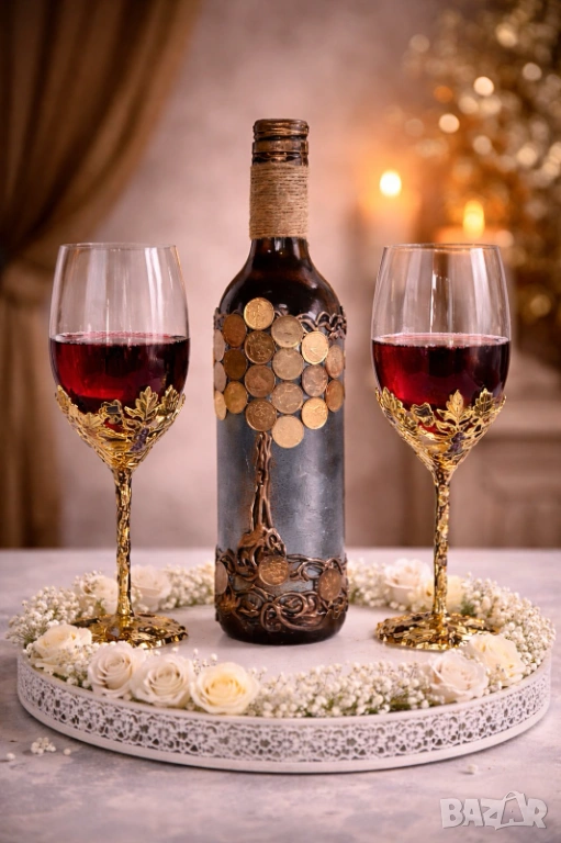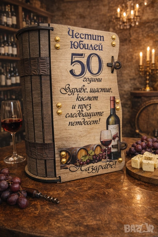 Сувенирен подарък - каручка с две чашки и бутилка - 400 мл. за 50, 60 или 70 годишен юбилей със съответните цифри на юбилея и детелина с пожелание. В допълнение апликирана бутилка с капачка на винт и друго съдържание, златни цифри и дървена плочка-пожелание за съответния юбилей. /Може да се ползва и в последствие/