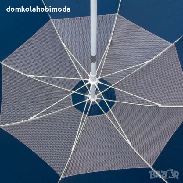 Ветрозащитен плажен чадър в комплект с здрав полиестерен калъф за носене. Има механизъм за накланяне, който заключва и обезопасява наклона.