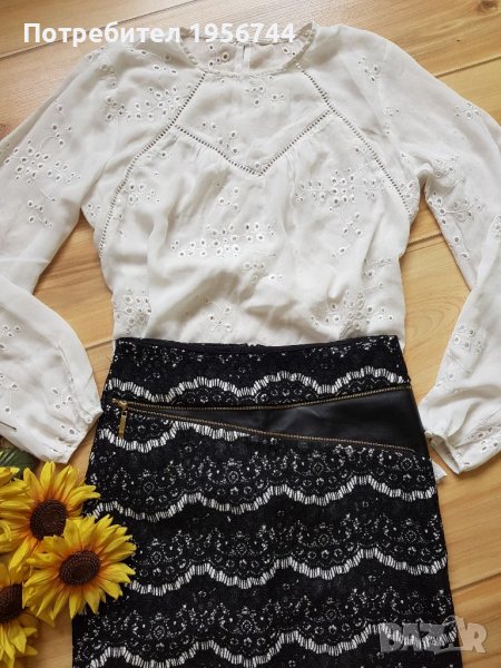 Елегантен, стилен, модерен сет в бяло и черно размер S. Италианска пола, много интересен модел, с цип отпред, който се регулира, права, тясна по тялото. Към нея бяла, много красива блуза на Strsdivarius. Носени са броени пъти!
