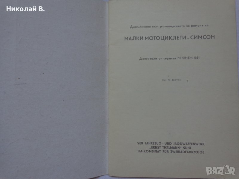 Продавам употребявана но запазена книга Доълнение към Ръководство за ремонт на малки мотоциклети Симсон двигатели серия М531/541 VEB FAHRZEUG-UND JAGDWAFFN WERK " ERNST TH'A'LMANN SUHL -DDR IFA-KOMBINAT FUR ZWEIRADFAHRZEUGE .